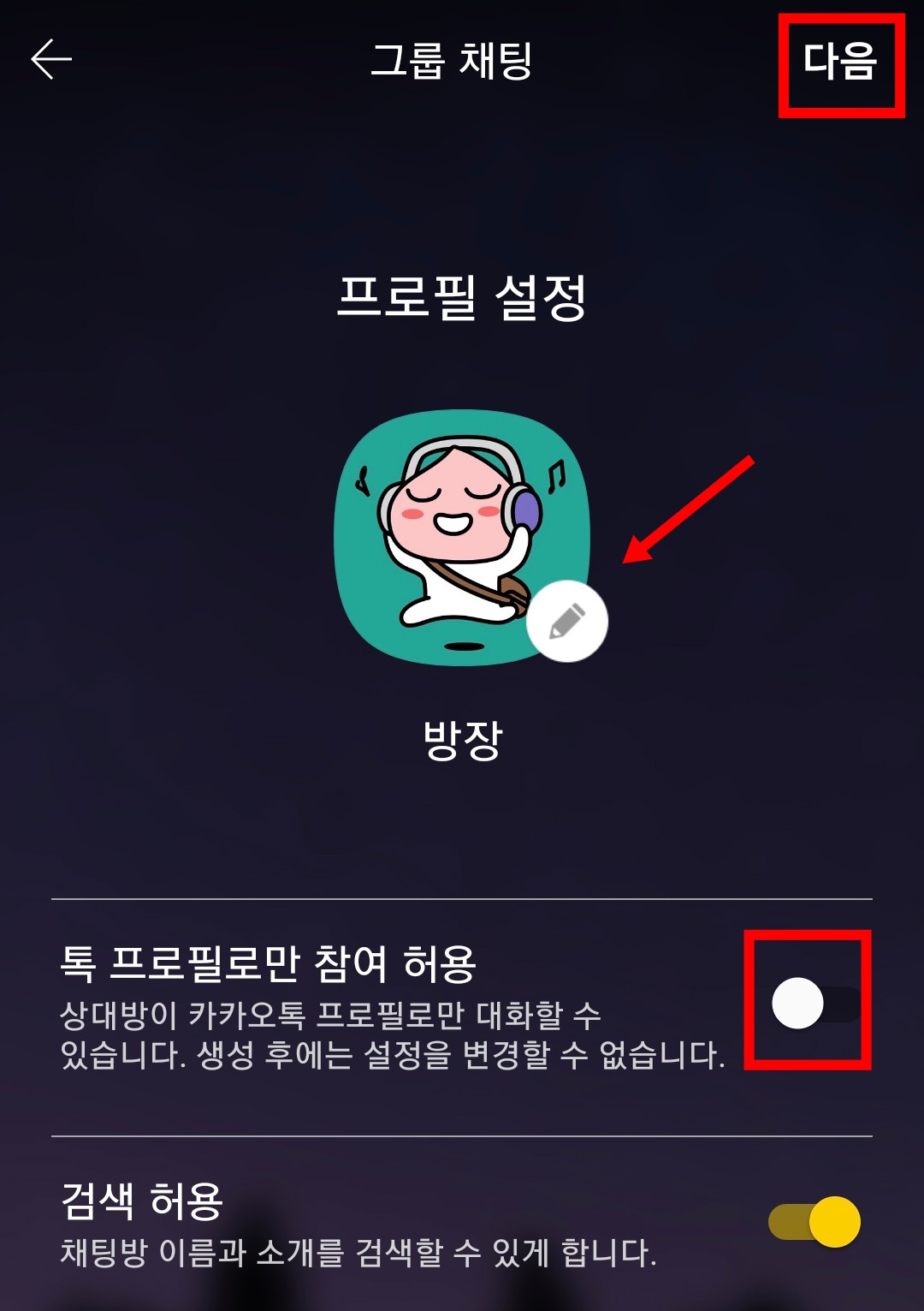 7. 화살표에 있는 연필버튼을 누르면 본인의 카톡 프로필을 그대로 사용할 것인지, 카카오톡에서 제공하는 이모티콘을 사용할 것인지 설정할 수 있습니다. 그런 다음, 다음 버튼을 눌러주세요.