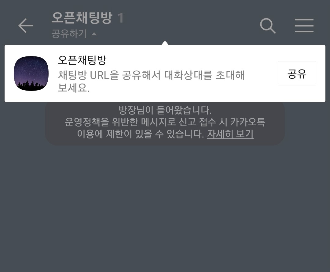 9. 오픈채팅방이 생성됩니다. 여기서 공유 버튼을 눌러 대화상대를 초대할 수 있습니다.