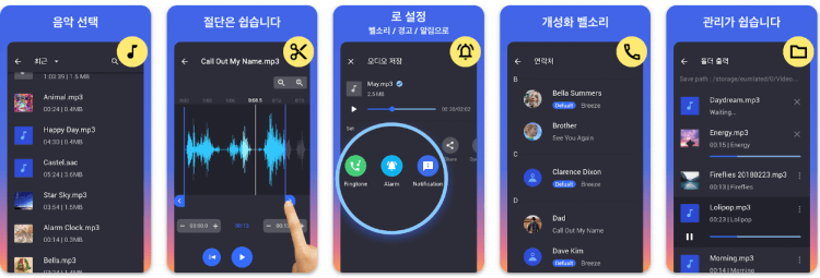 구글 플레이스토어에서 찾을 수 있는 음악 커터 & 벨소리 만들기 어플을 추천합니다. 이 어플에는 여러가지 특징들이 있습니다. 아래 내용을 참고하세요.